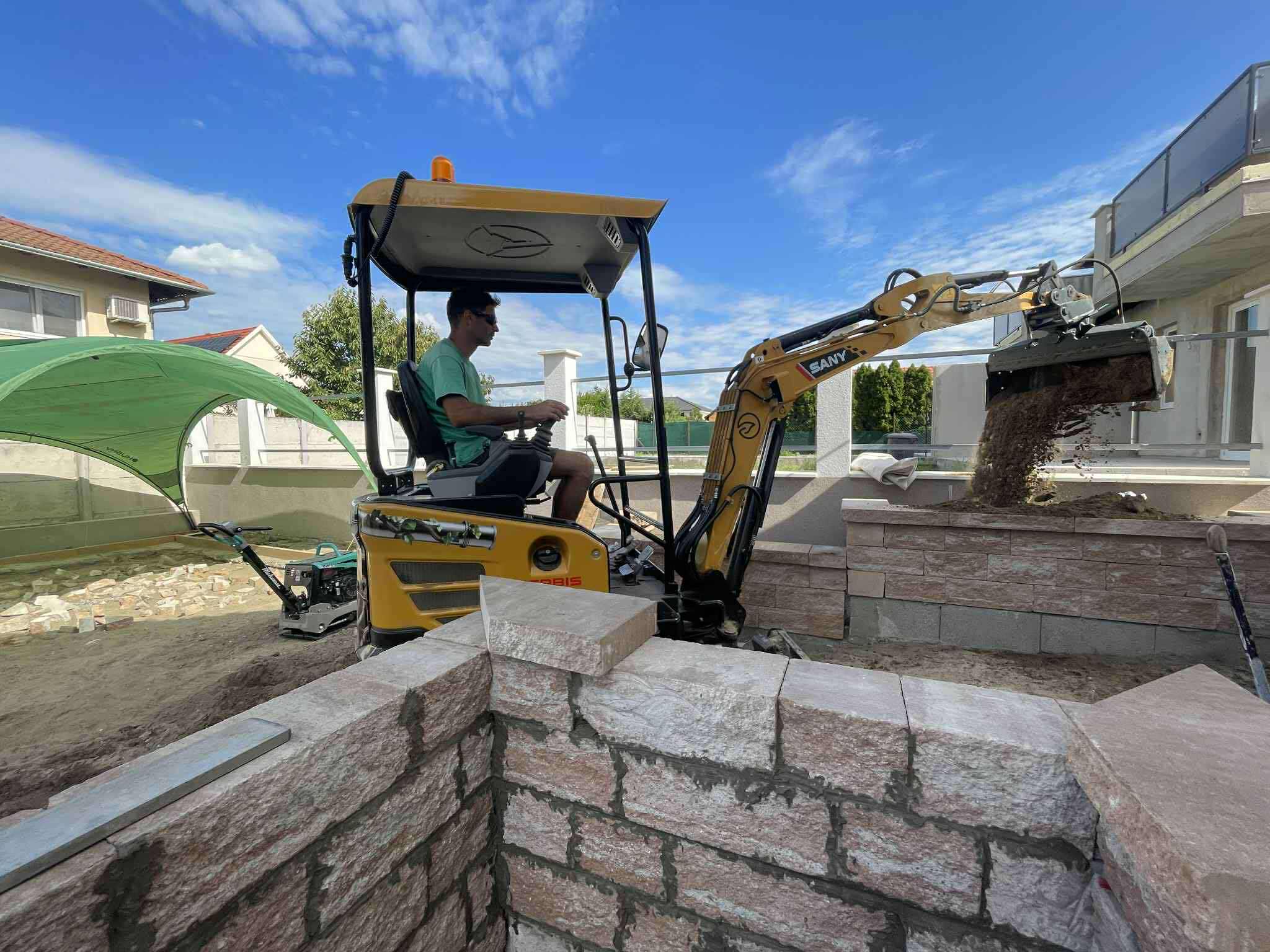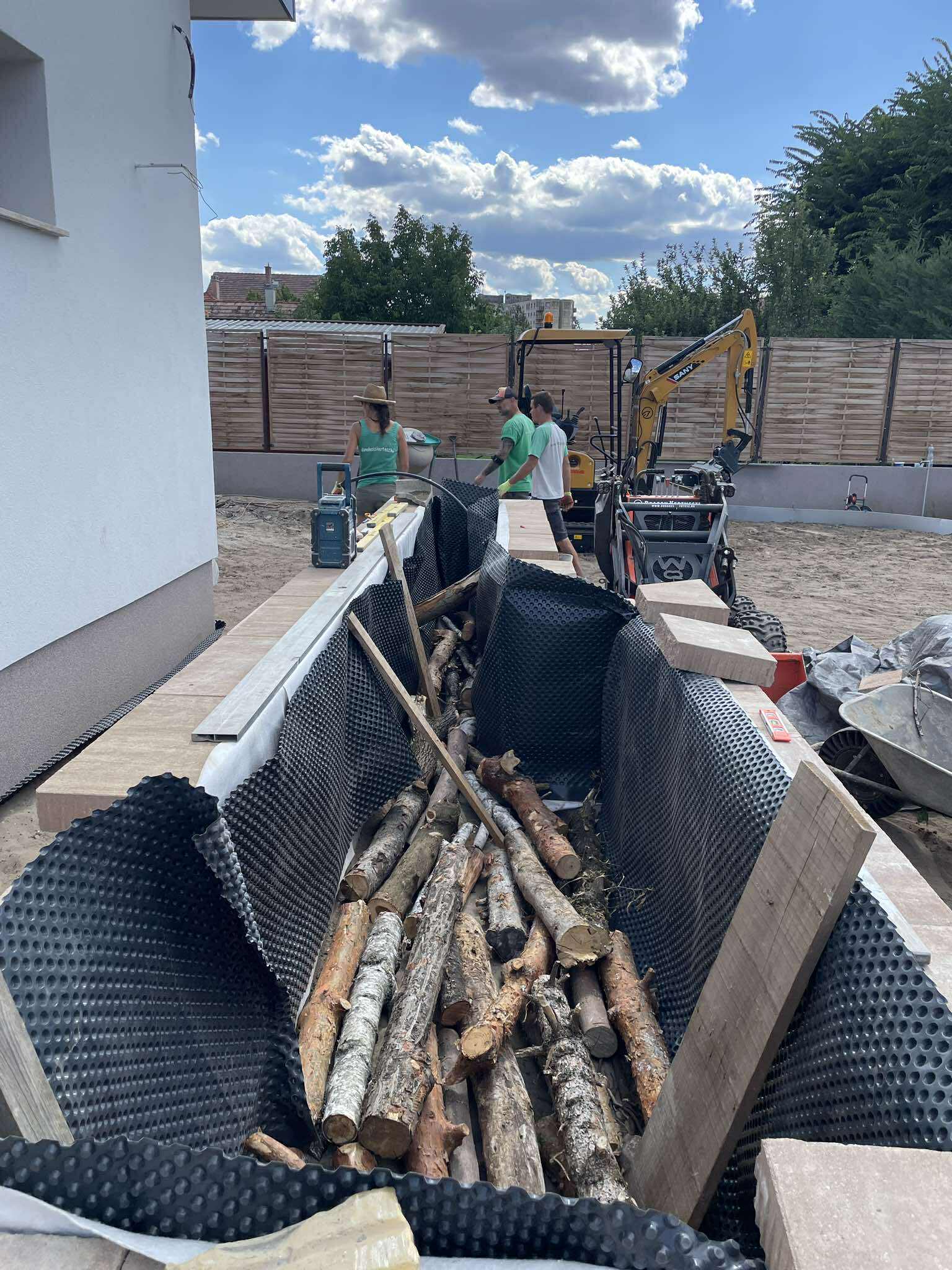Az itt bemutatott magaságyások méretüket tekintve robosztusak, de a kert adottságai ezt lehetővé teszik. Beton alapra építettük, geotextíliával és drénlemezzel béleltük, majd növényi zöldhulladékból és komposztból álló alapréteggel megtöltve hosszú időre megoldottuk a tápanyag utánpótlást. A tetejére kerülő jó minőségű termőföldben a gyökerek szabadon terjeszkedhetnek majd, így garantált a növények egészséges fejlődése.