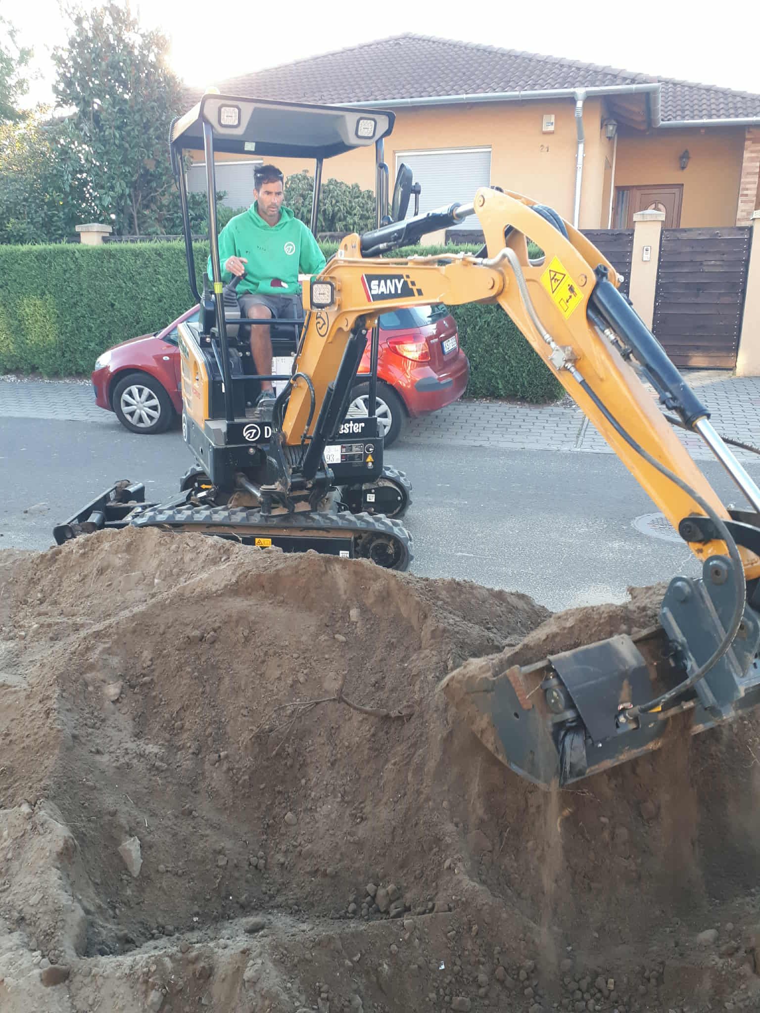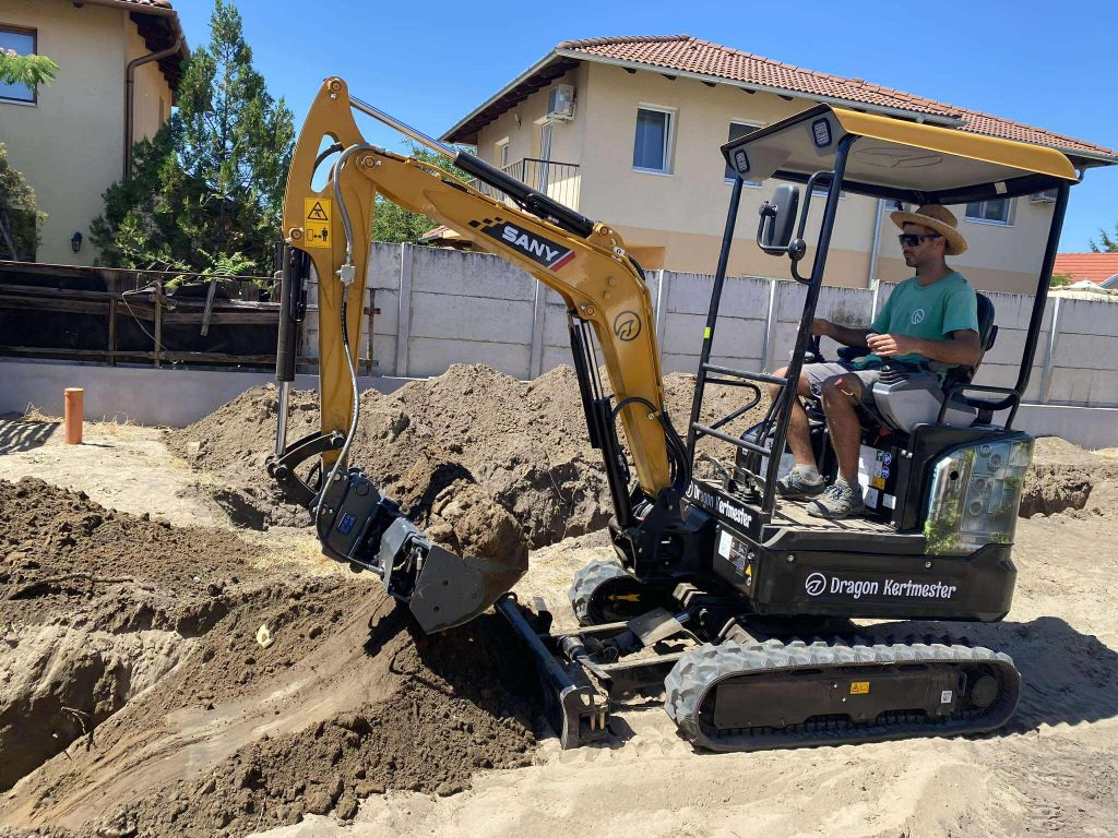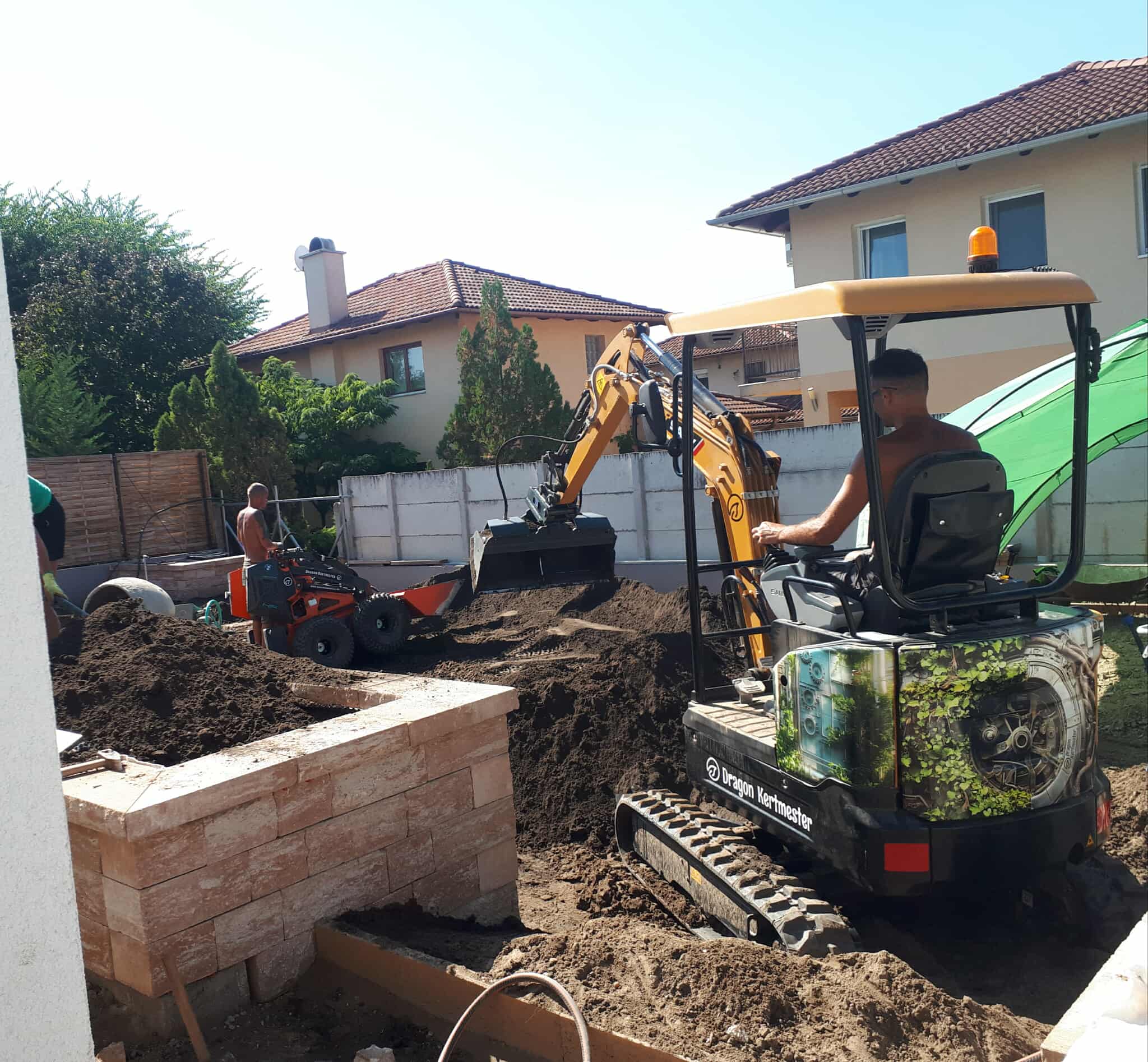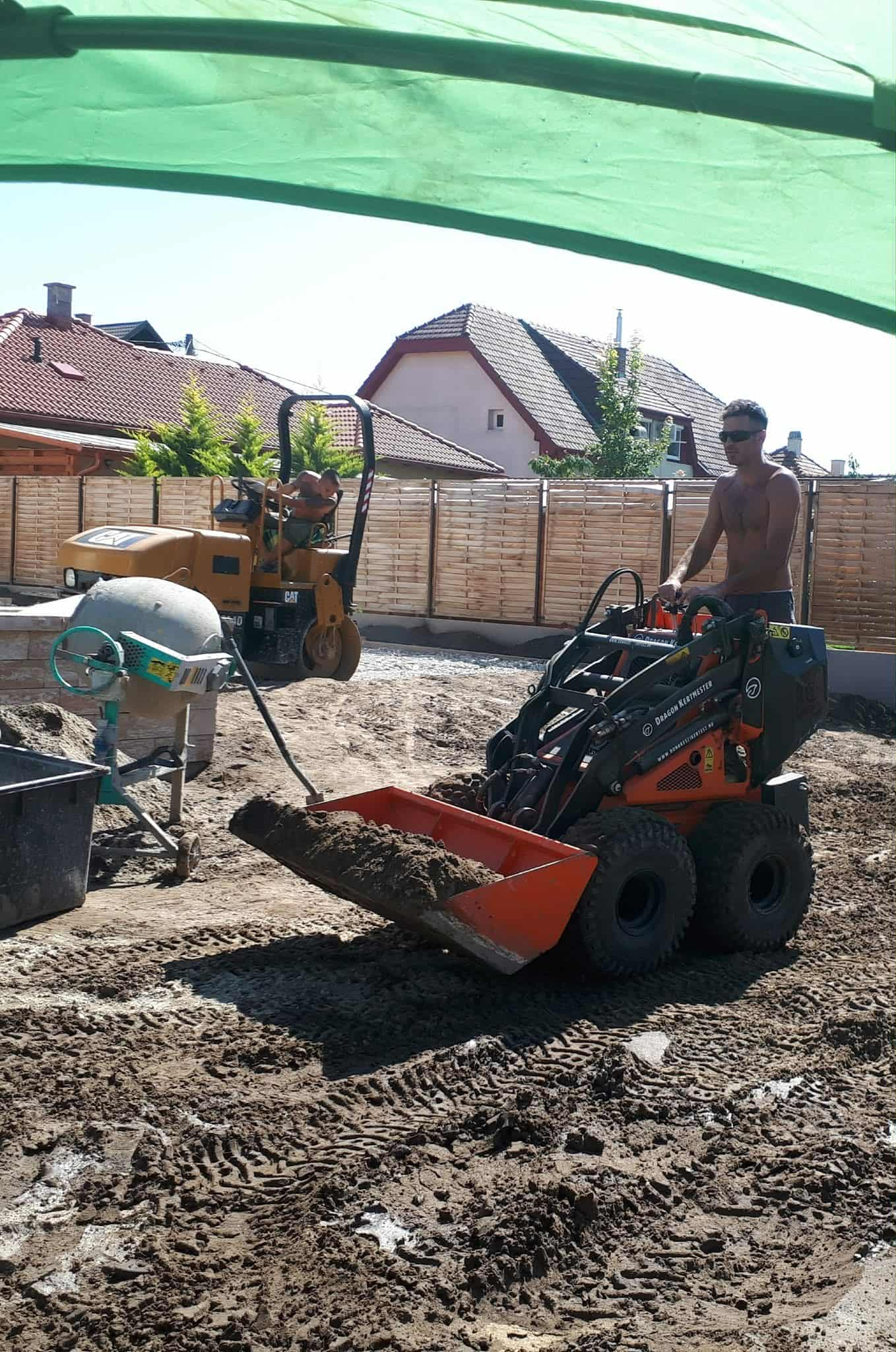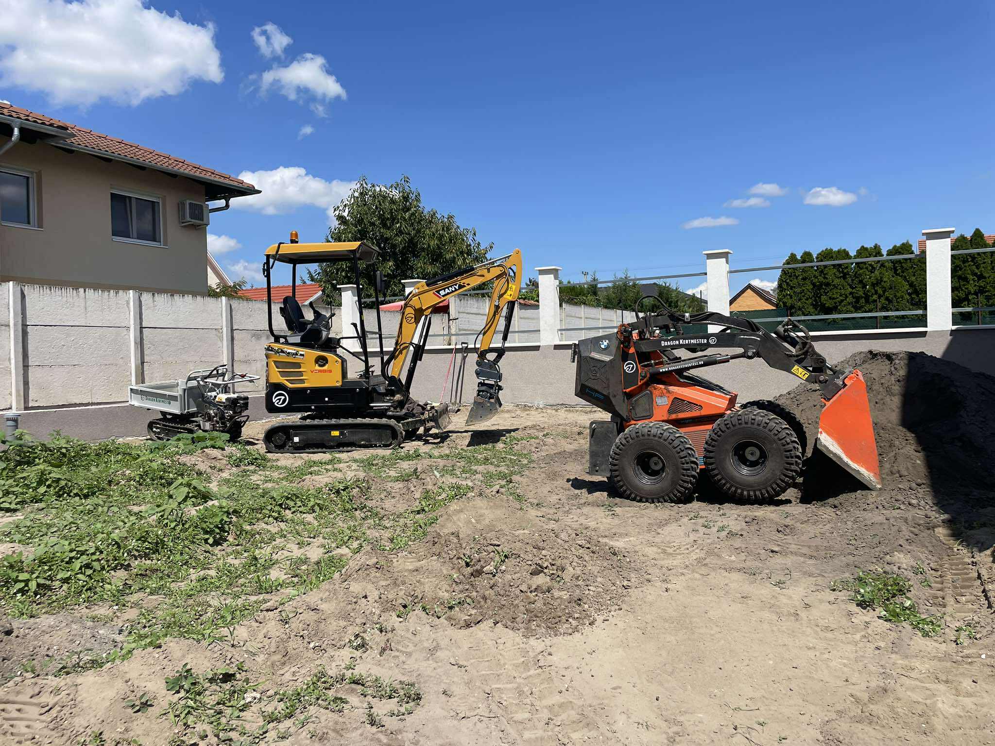 Sanyi, a gumilánctalpas árokásó / markoló gépünk úgyszintén alkalmas a kis helyen történő munkavégzésre. Már 1 m széles területen is hatékony, illetve a nyitott és leszerelhető bukókeret és tető révén az alacsonyabb, 1,6 m magasságú munkaterületekre pl. alacsonyabb előtetők alá is könnyedén bejut. Könnyű súlya, kis mérete miatt a már meglévő kertekben, gyepen, térkövön is kiválóan alkalmazható. A különböző adapterek lehetővé teszik a sokoldalú felhasználást, árokásási mélysége 2,36 méter. Hatékony és ideális segítség mindennemű kertépítési munka ( pl. szikkasztó telepítése, fatuskók eltávolítása, növénykiültetés – gyeptelepítés, anyagmozgatás, földmunkák, térburkolás, kerítés építése, különböző bontási feladatok ) során , amely lehetővé teszi számunkra a gyorsabb és eredményesebb munkavégzést.