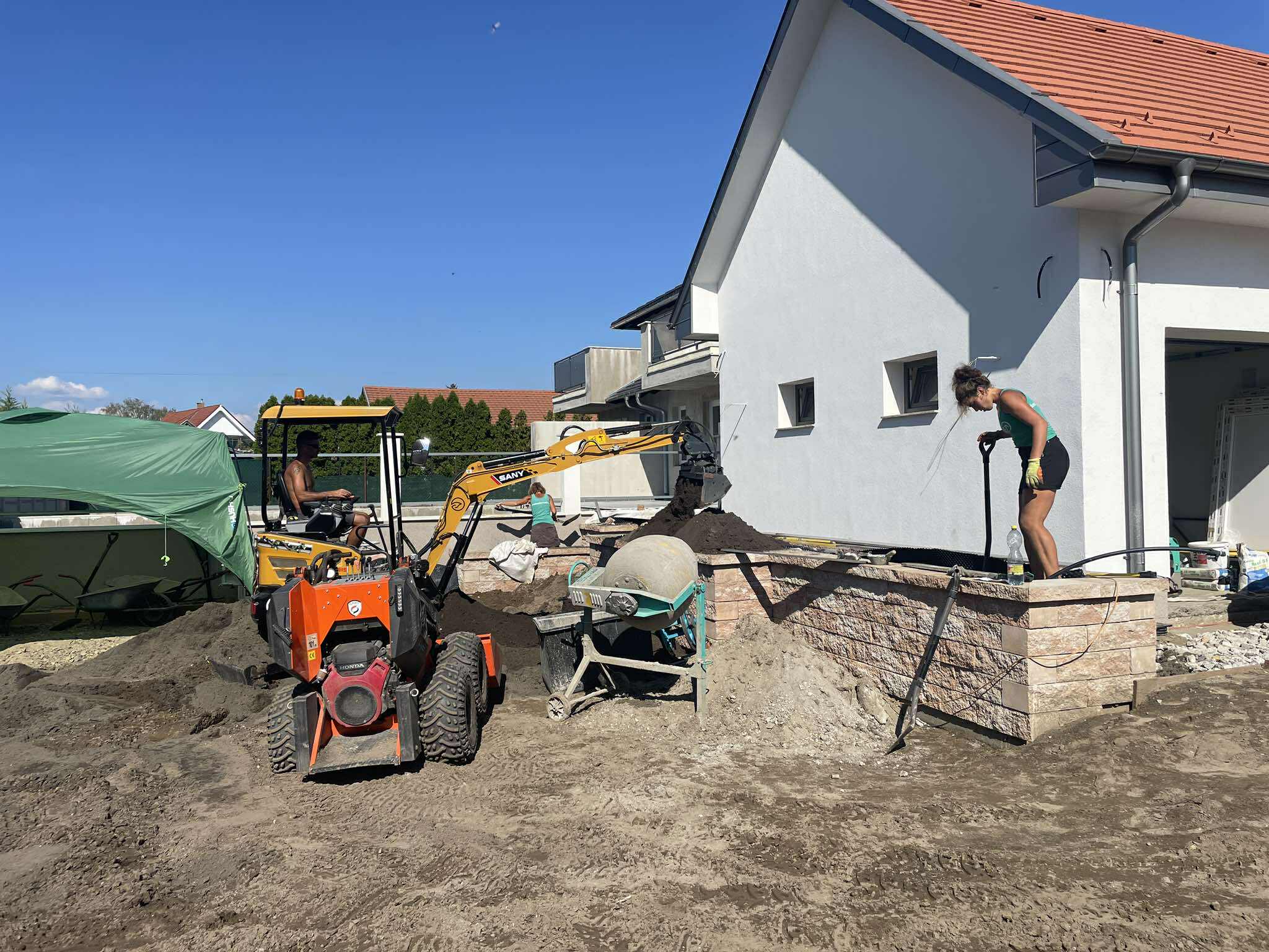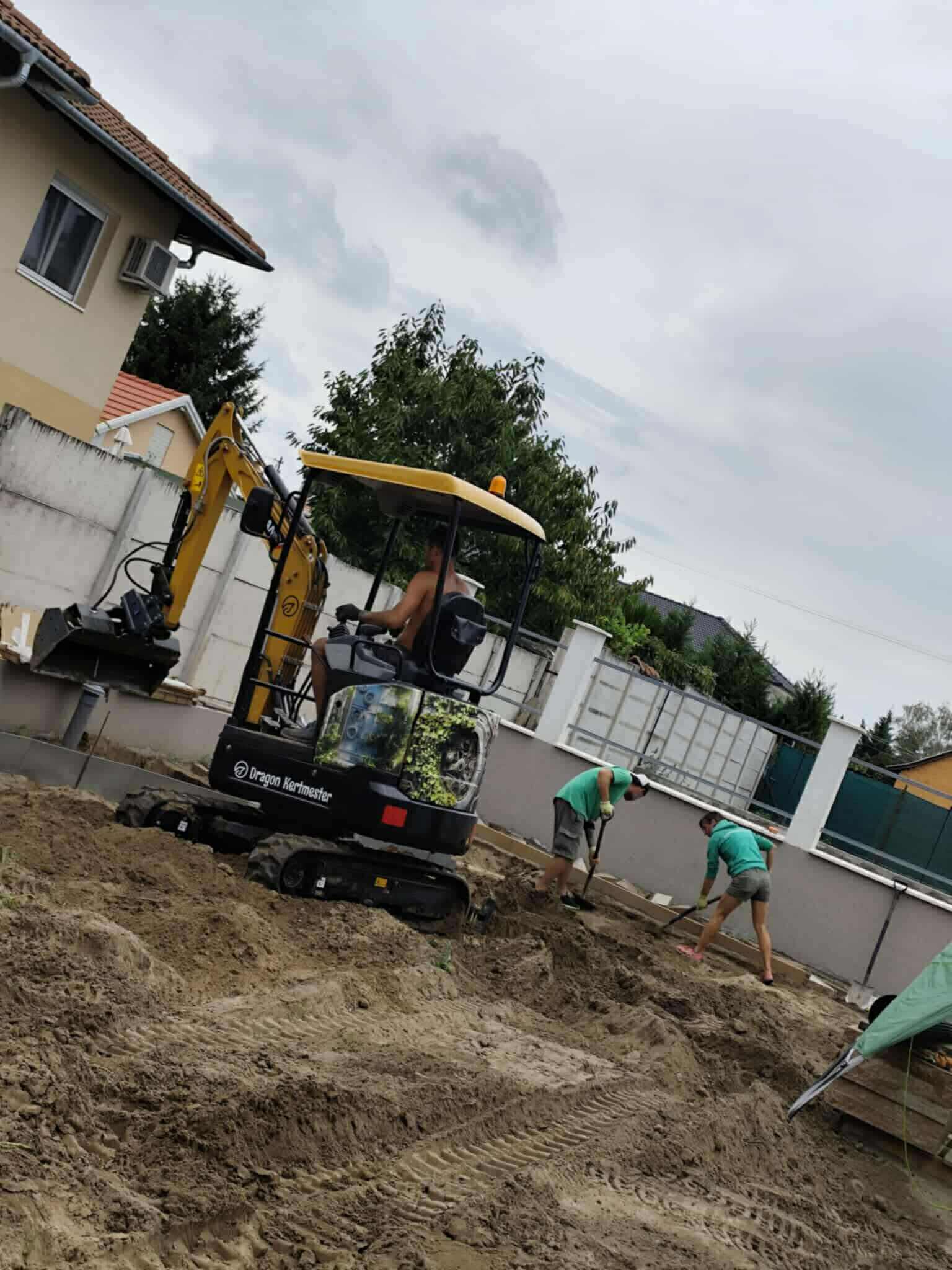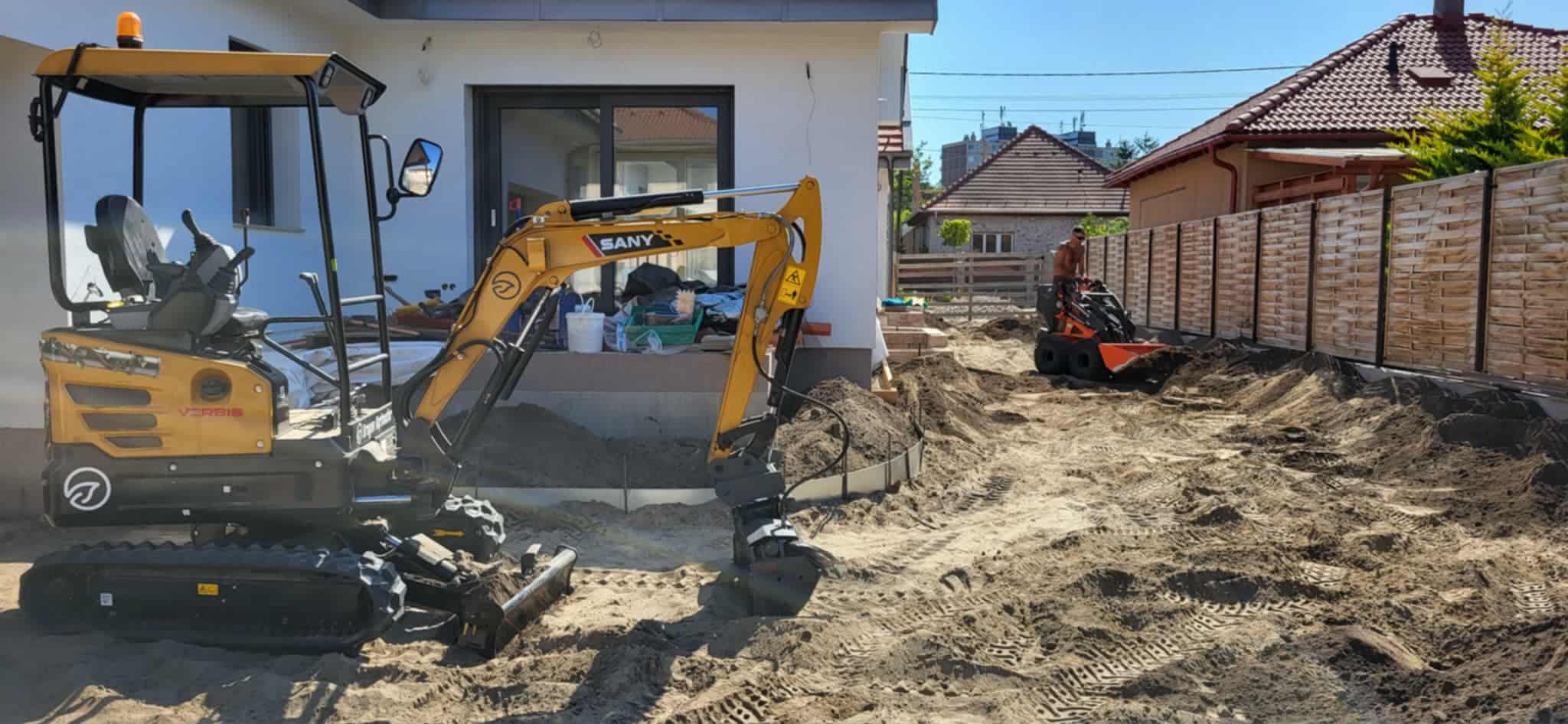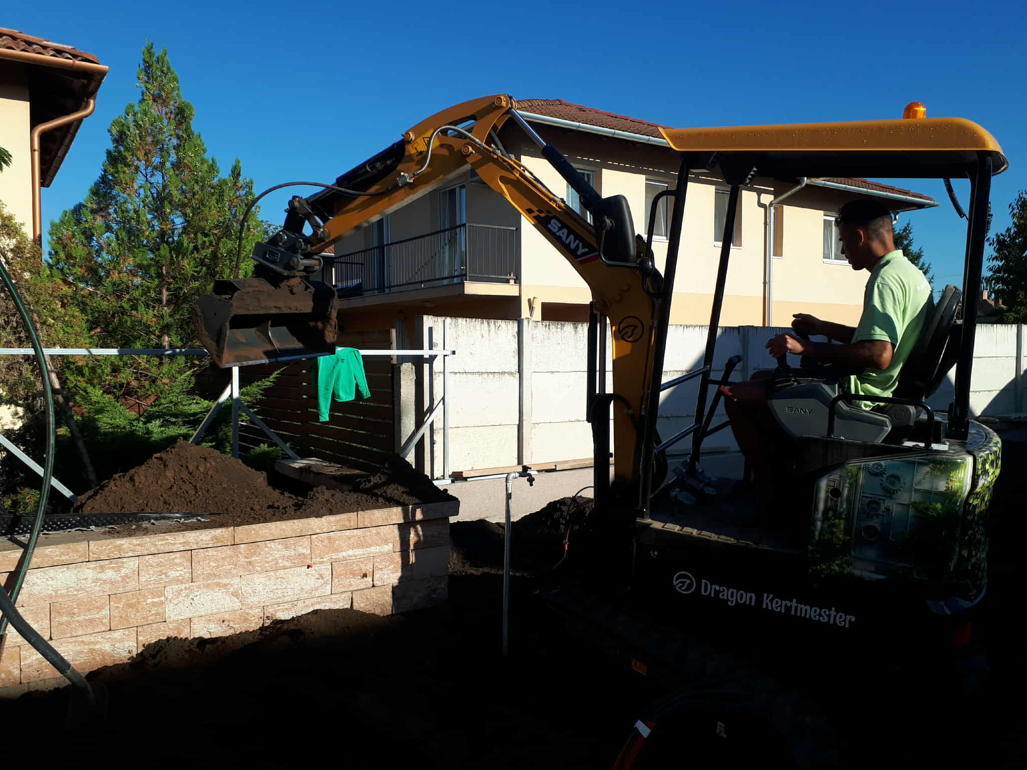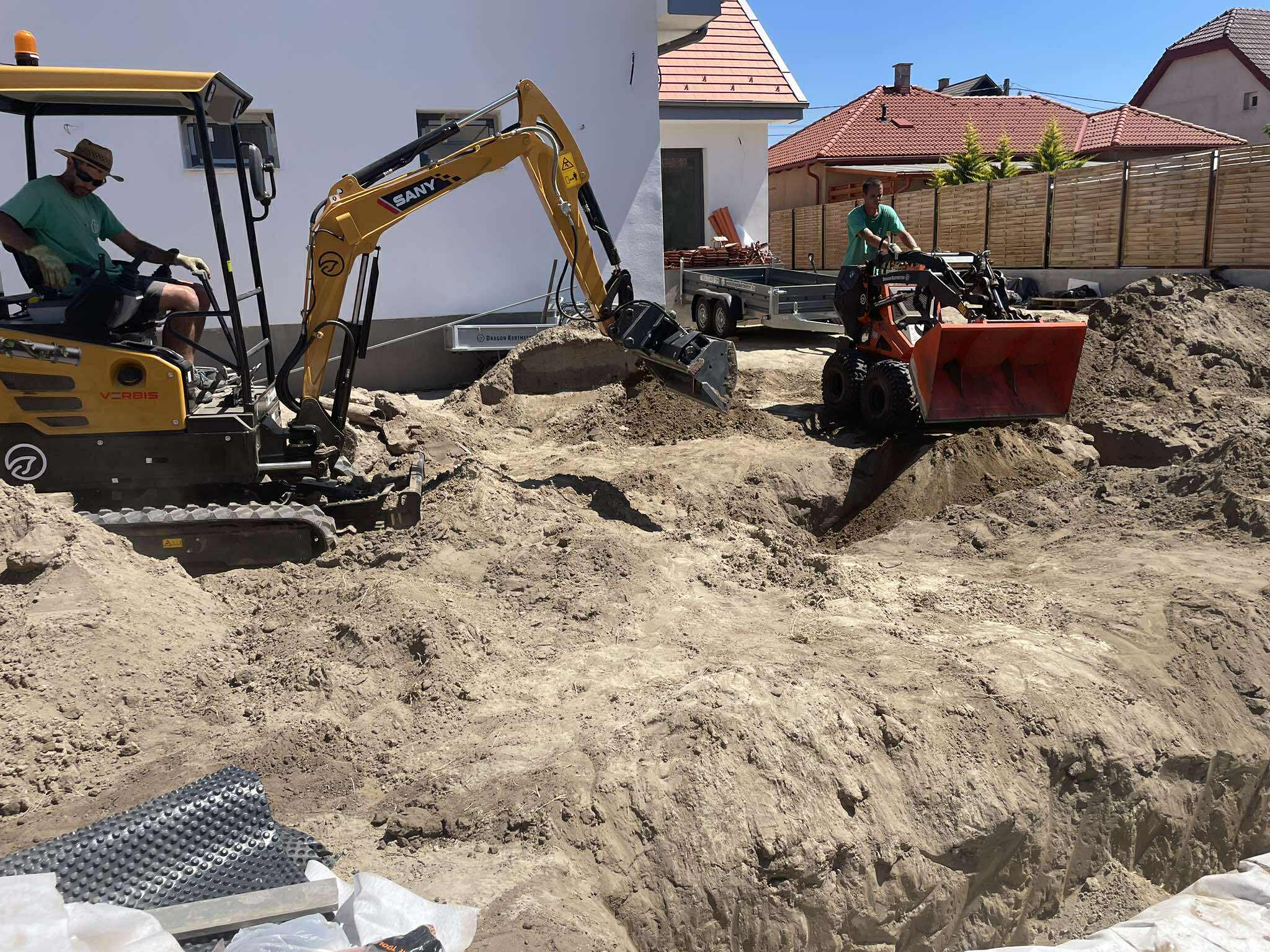 Sanyi, a gumilánctalpas árokásó / markoló gépünk úgyszintén alkalmas a kis helyen történő munkavégzésre. Már 1 m széles területen is hatékony, illetve a nyitott és leszerelhető bukókeret és tető révén az alacsonyabb, 1,6 m magasságú munkaterületekre pl. alacsonyabb előtetők alá is könnyedén bejut. Könnyű súlya, kis mérete miatt a már meglévő kertekben, gyepen, térkövön is kiválóan alkalmazható. A különböző adapterek lehetővé teszik a sokoldalú felhasználást, árokásási mélysége 2,36 méter. Hatékony és ideális segítség mindennemű kertépítési munka ( pl. szikkasztó telepítése, fatuskók eltávolítása, növénykiültetés – gyeptelepítés, anyagmozgatás, földmunkák, térburkolás, kerítés építése, különböző bontási feladatok ) során , amely lehetővé teszi számunkra a gyorsabb és eredményesebb munkavégzést.